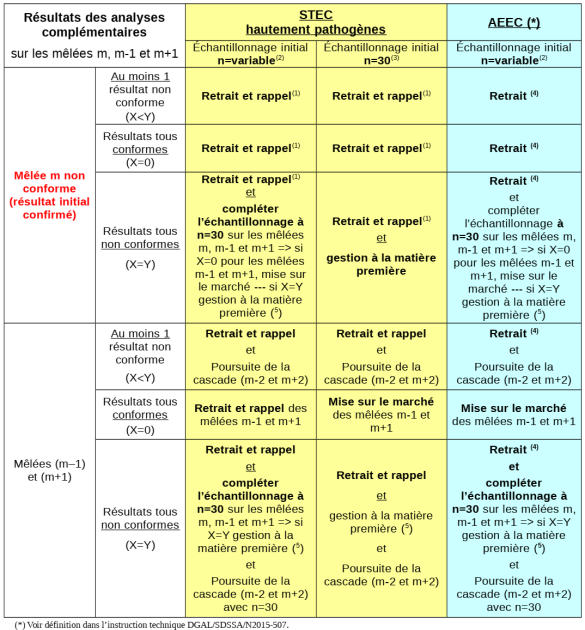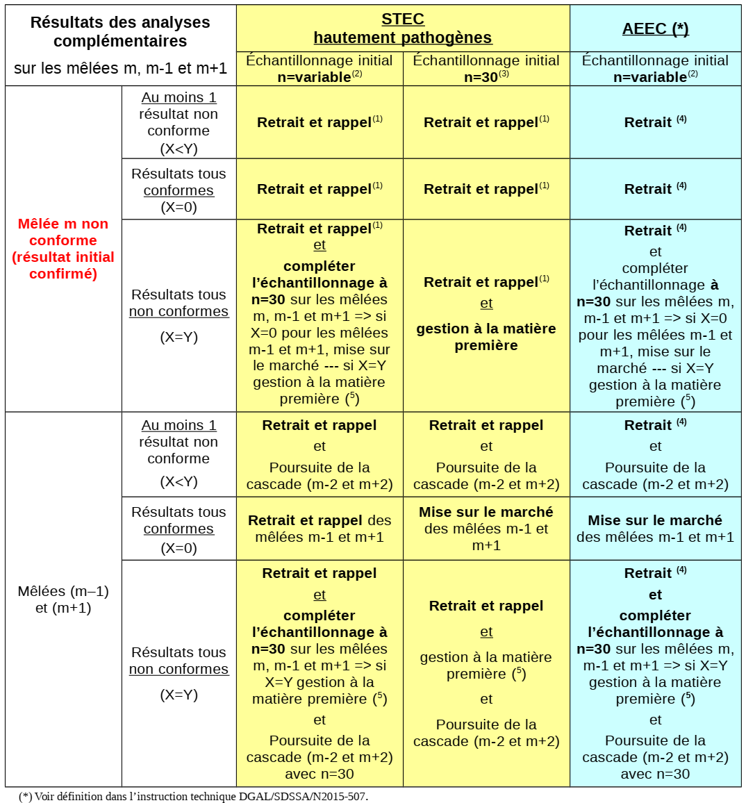 (1) Si des difficultés sont rencontrées pour récupérer des produits à des fins d’analyses complémentaires (notamment dans le cas des produits réfrigérés pour lesquels la durée de vie est plus courte que pour les produits surgelés), les mesures de gestion (retrait + rappel) s’appliquent non seulement sur la mêlée m initialement non conforme, mais aussi sur les deux mêlées encadrantes (m-1 et m+1)